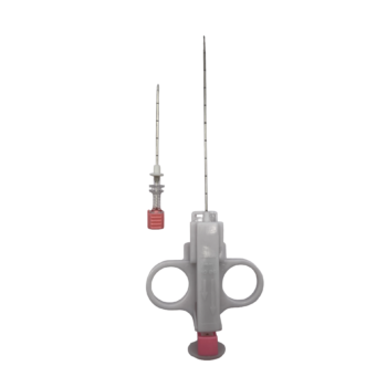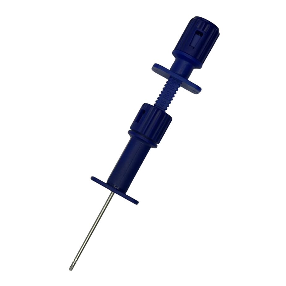 – An adjustable, removable needle stop safety controls depth of penetration