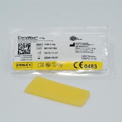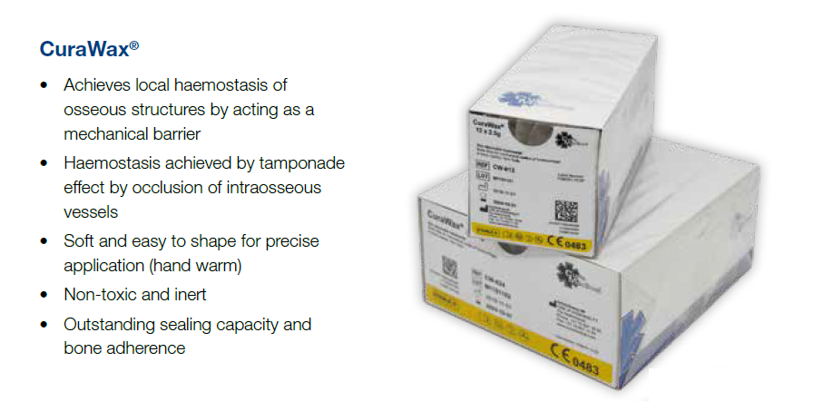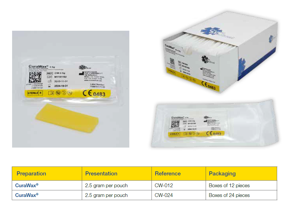 CuraWax® is used to control bleeding which can occur during osseous bleeding, acting as physical tamponade of the bone canals. Before CuraWax® is applied to the bone surface, it should be softened by the use of an aseptic technique until the desirable consistency is achieved. CuraWax® is used for the mechanical haemostasis in osseous structures in Thoracic surgery, Neurosurgery, Orthopaedics, Traumatology, Dental, Oral and Jaw surgery. CuraWax® does not induce a biochemical reaction within the organism, since it is a non-absorbable, non-toxic and inert product.