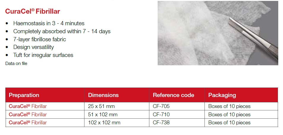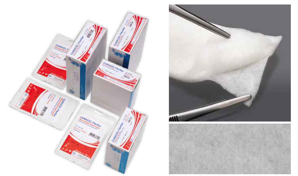 CuraCel® Absorbable Haemostat is a sterile product made of oxidised regenerated cellulose (polyoxyan hydro glucuronic acid) available in standard fabric, high-density fabric and a 7-layer fibrillose (fibrillar) form. CuraCel® Haemostat can be cut into any desired dimension. CuraCel® Haemostat is applied dry. It can be laid on, held against or wrapped around a bleeding surface. As special features, CuraCel High Density can be sutured, and CuraCel Fibrillar can be peeled off in layers for optimal dosage. Action mechanism of CuraCel® is independent from blood coagulation mechanism of the body. When it contacts with blood, CuraCel® Haemostat forms a brownish or black gelatinous mass which aids clot formation. This gelatinous mass acts as a physical matrix to which platelets can adhere. With platelet aggregation and formation of a platelet-fibrin plug, haemostasis occurs. When CuraCel® Haemostat is used properly in minimal amounts, it is absorbed from the sites of implantation without tissue reaction. It is completely absorbed within 7-14 days.