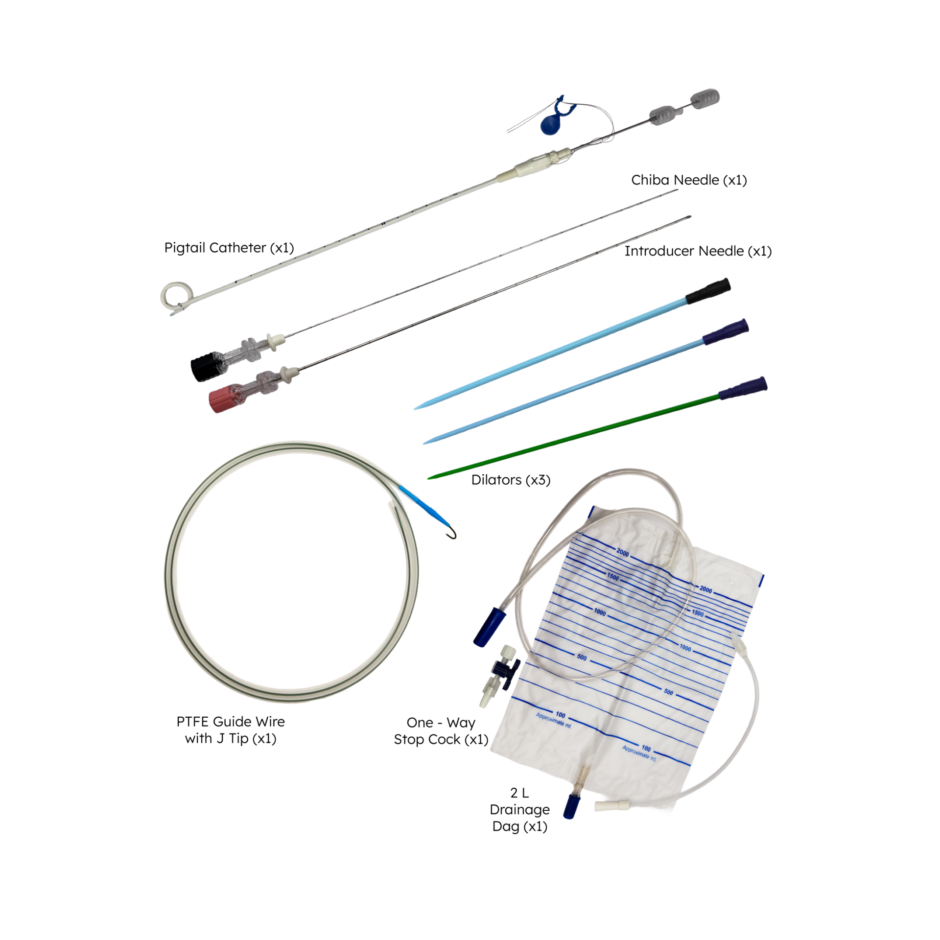 – Radiopaque polyurethane Pigtail catheter with Stiffener -Two-piece nephrostomy needle with the possibility of Kidney puncture with the 22ga needle and the introducer 18ga needle